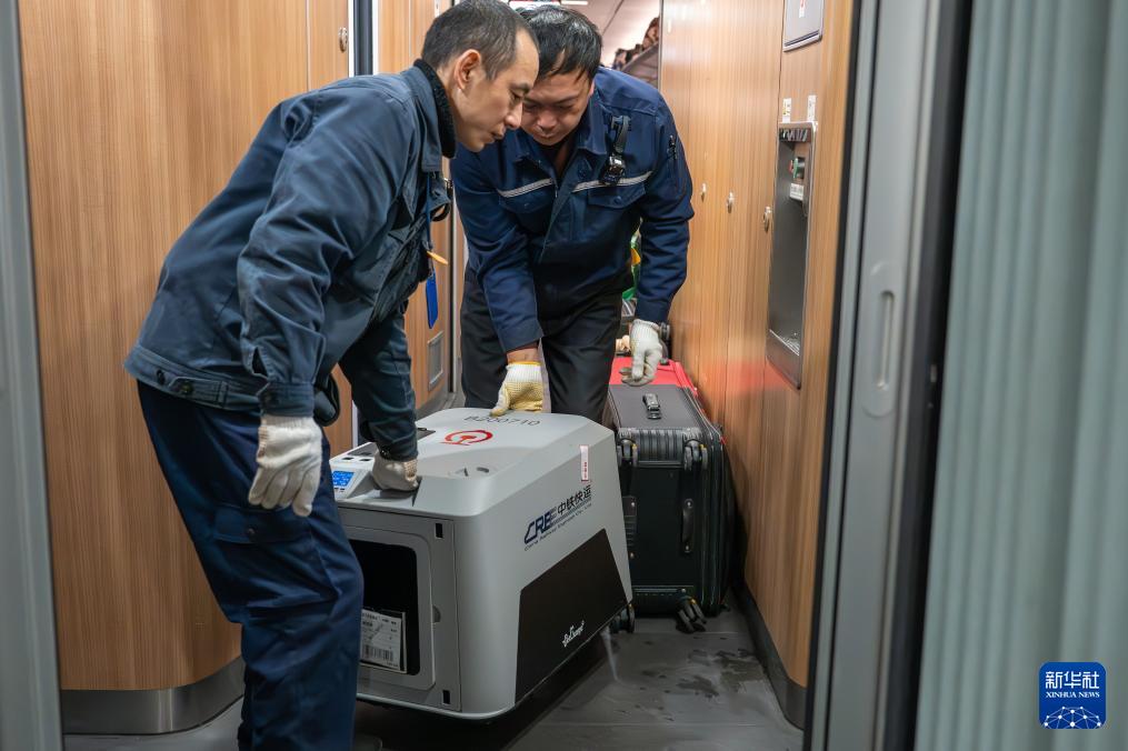 2月3日,在湖北武汉火车站,工作人员将“高铁宠物运输智能箱”搬下列车。