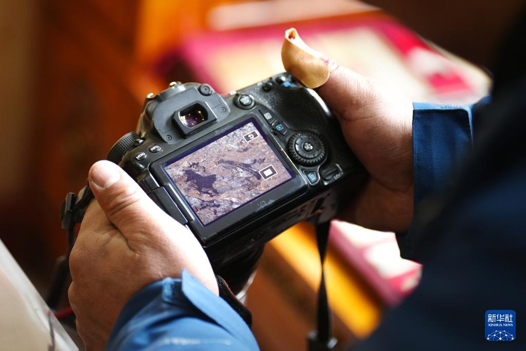 1月29日,次丁在青海省玉树藏族自治州杂多县昂赛乡的家中查看之前拍下的雪豹照片。
