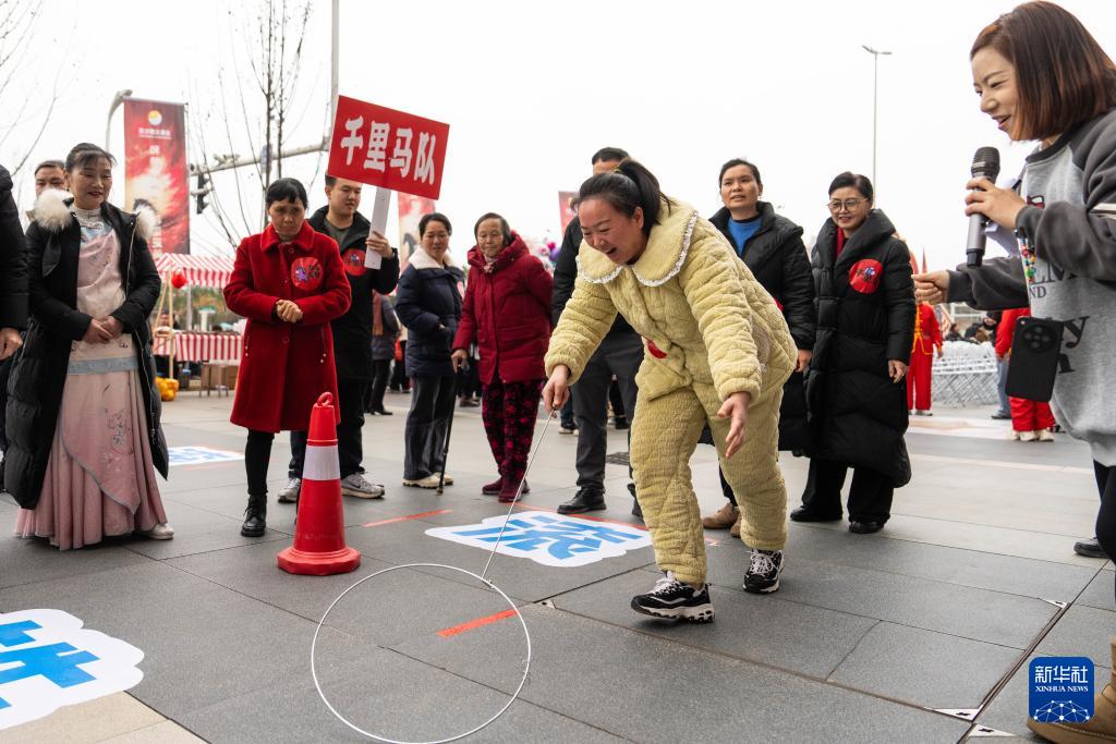 2月3日,在长沙市望城区大泽湖街道金星北路社区,市民参与踢毽子游戏。