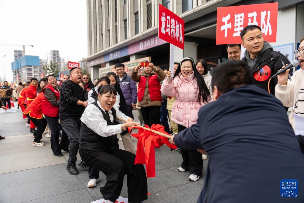 2月3日,在长沙市望城区大泽湖街道金星北路社区,市民进行拔河比赛。