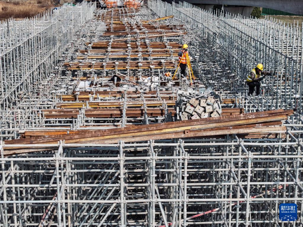 2月3日,中铁建城通公司工人进行盘扣支架搭设(无人机照片)。