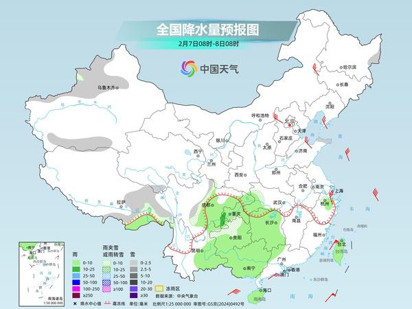 明天,此次雨雪过程将减弱、收尾,降水主要集中在西南地区东部到江南西部一带。预计新疆沿天山地区和南疆盆地、西藏东南部、青海南部、川西高原、贵州北部等地部分地区有小雪或雨夹雪。西藏东南部、江南西部、西南地区东部和南部、华南大部、台湾岛等地部分地区有小雨,其中,四川盆地东南部等地部分地区有中雨。
