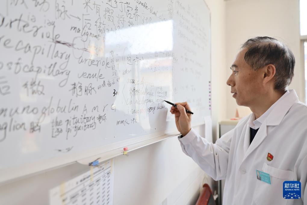 在天津市蓟州区穿芳峪镇卫生院,刘宏亮将学术期刊中的英语词汇记录下来(2月4日摄)。