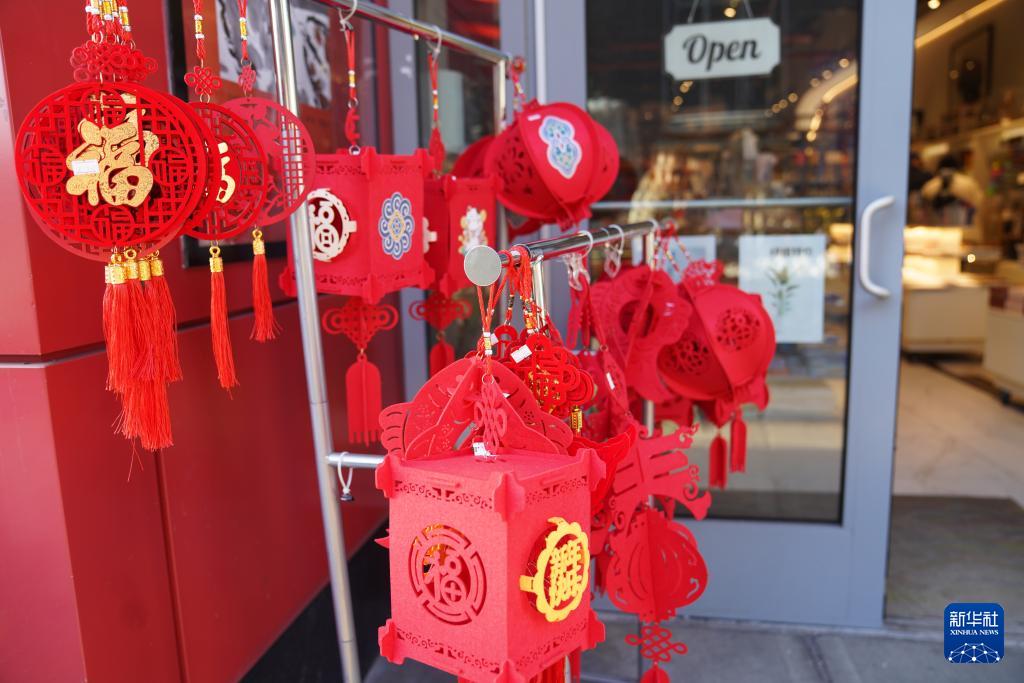 近日,在美国纽约皇后区法拉盛,春节主题装饰和商品在一些商场和街边商铺出现,增添了喜庆的节日氛围。