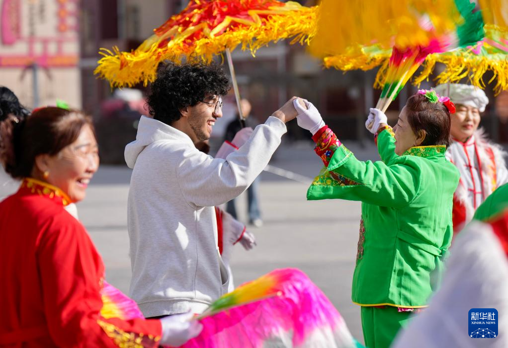 2月5日,北方民族大学国际教育学院的留学生在宁夏银川市西夏区芦花洲社区和当地居民一起扭秧歌。