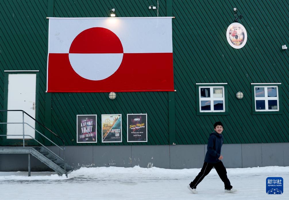 2月8日,在丹麦自治领地格陵兰岛首府努克,一名男孩在格陵兰岛旗帜前玩耍。