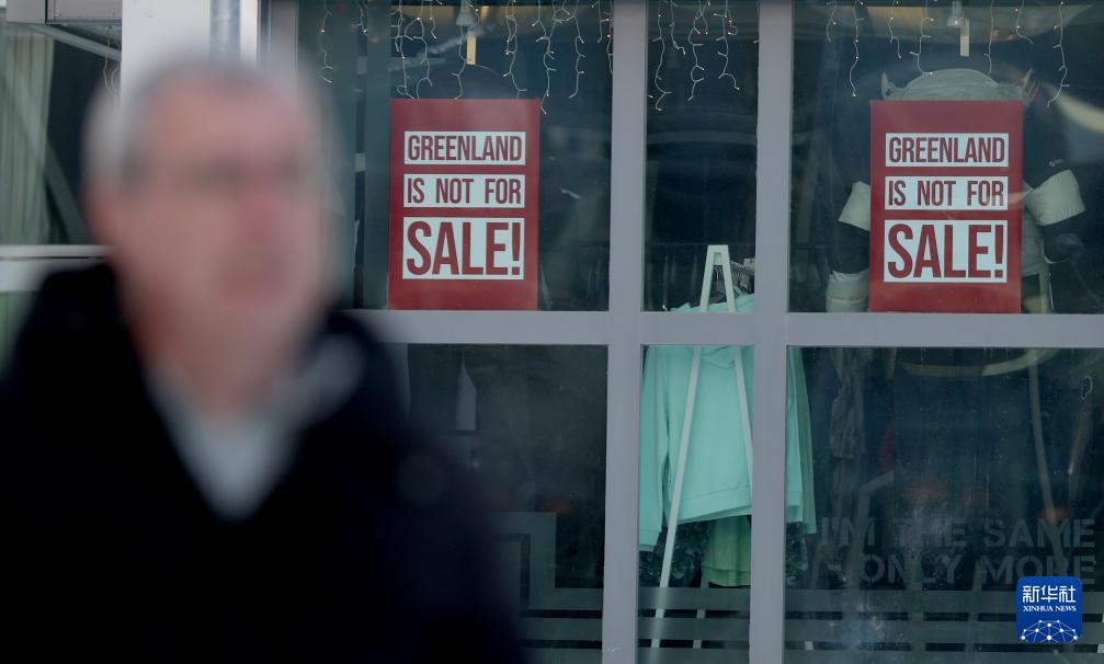 2月8日,在丹麦自治领地格陵兰岛首府努克,一家商铺橱窗上贴着“格陵兰岛不出售”标语。