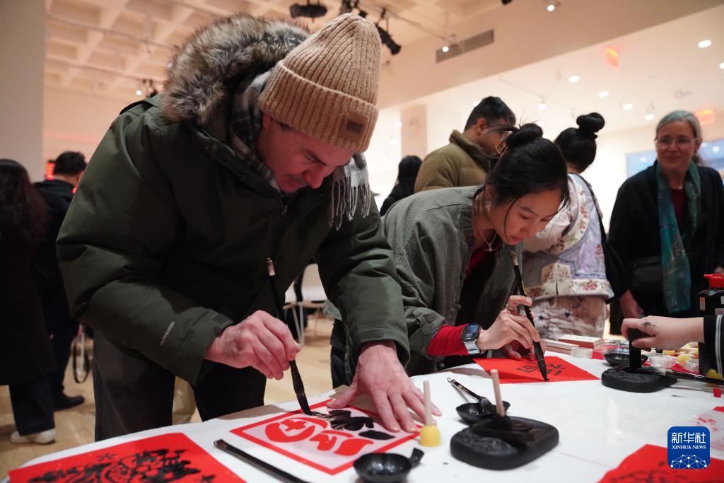 2月8日,在美国纽约举行的“中国味道”春节文化活动上,人们体验中国书法。