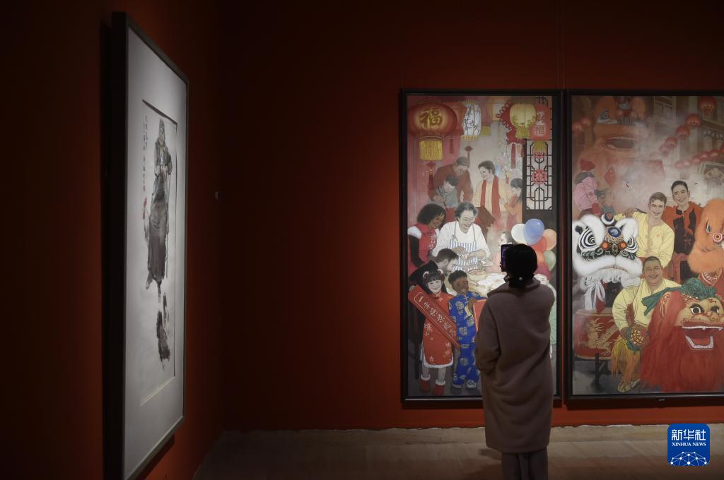 2月9日,嘉宾在中国美术馆参观拍摄展出的绘画作品《欢乐春节》。