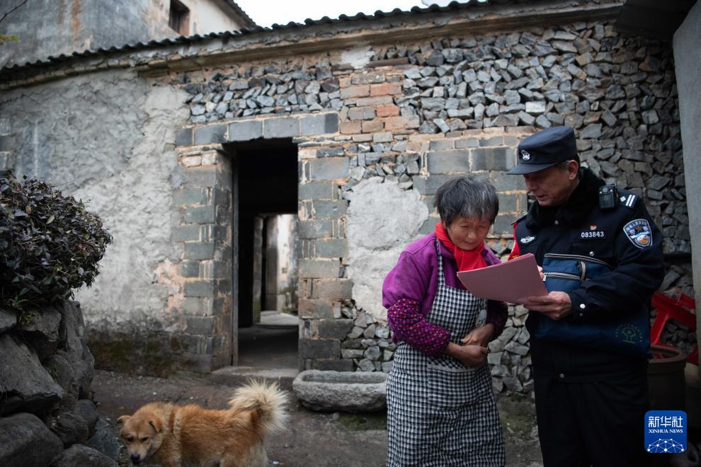 2月8日,在安徽省宣城市绩溪县,汪七成(中)向沿线居民宣传铁路安全知识。