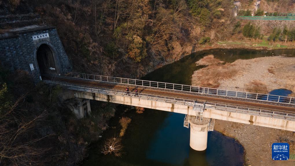 2月8日,在安徽省宣城市绩溪县扬溪镇,汪七成(右)和同事王宇在巡线路上(无人机照片)。