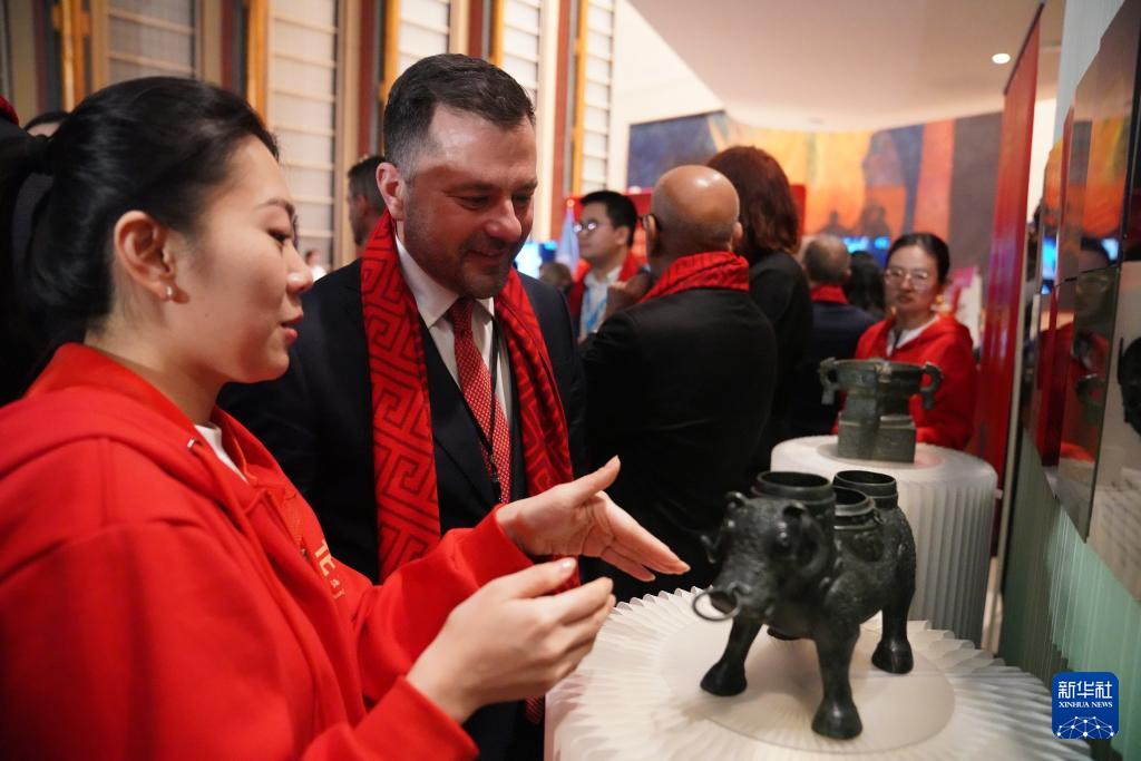 2月9日,在联合国总部举行的“骏启新程”新春庆祝活动上,一名嘉宾听取关于青铜器的讲解。