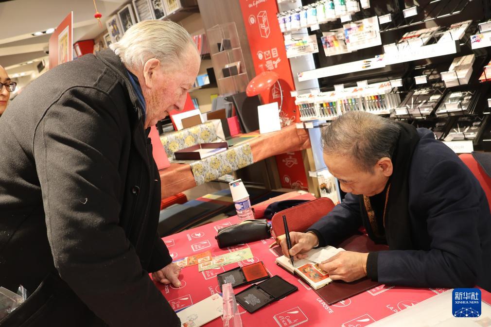 2月6日,在法国巴黎举行的邮票发行仪式上,邮票设计者陈江洪为集邮爱好者签字留念。