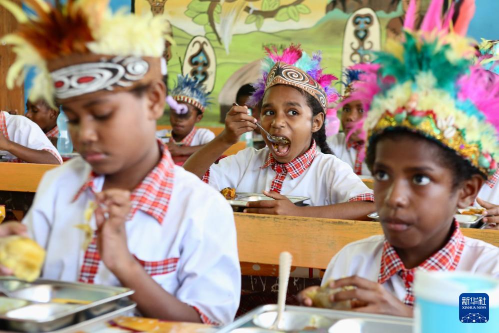 2月4日,印度尼西亚巴布亚省首府查亚普拉一所小学的学生享用营养午餐。