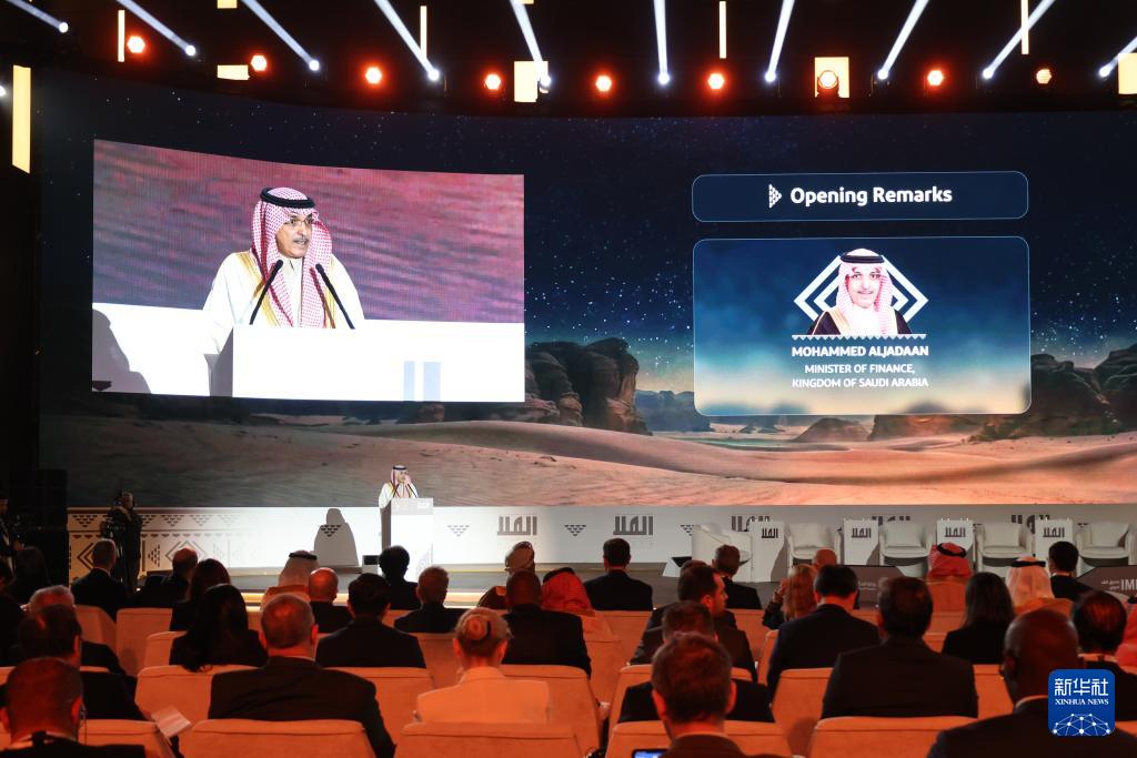 2月8日,在沙特阿拉伯西北部城市埃尔奥拉,沙特阿拉伯财政大臣穆罕默德·贾丹在第二届新兴市场经济体埃尔奥拉会议开幕式上致辞。
