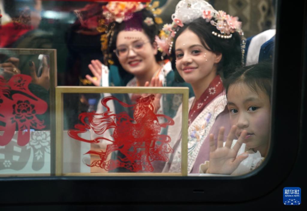 2月10日,参加演出的外国留学生与小旅客在列车内招手。