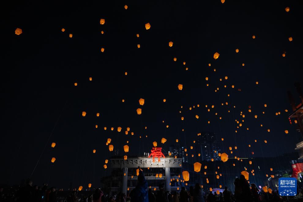 2月10日,在重庆市磁器口古镇,千盏孔明灯齐放夜空。