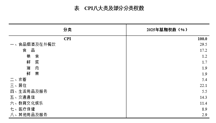 答:CPI权数是指按对比期价格购买“固定篮子”中各类商品或服务的支出占购买整个篮子所需支出的比重。权数来源以住户收支与生活状况调查中居民消费支出资料为主,部分小类和基本分类通过权数专项调查细化补充,并结合其他宏观数据、行业统计资料加以完善,确保权数客观真实反映居民消费结构。具体来看,食品烟酒及在外餐饮、衣着、居住、生活用品及服务、交通通信、教育文化娱乐、医疗保健、其他用品及服务八个大类的2025年基期权数分别为29.5%、5.4%、22.1%、5.5%、14.3%、11.4%、8.9%和2.9%。
