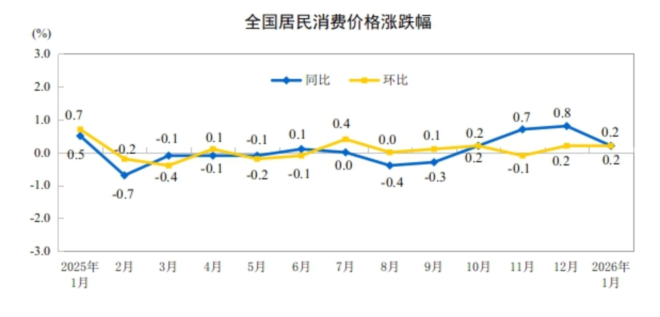 2026年1月份,全国居民消费价格同比上涨0.2%。其中,城市上涨0.2%,农村上涨0.1%;食品价格下降0.7%,非食品价格上涨0.4%;消费品价格上涨0.3%,服务价格上涨0.1%。
