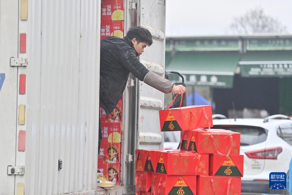 2月11日,在柳州市柳南区瑞龙路一家农产品批发市场,市民将年货搬上车。