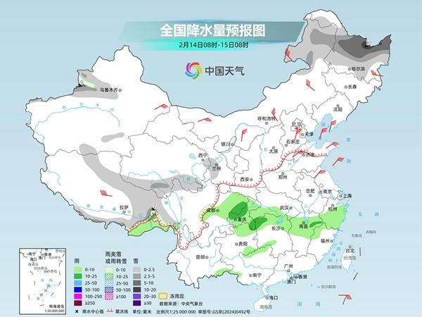 明天,新疆沿天山地区西段、内蒙古东北部、黑龙江、青海南部、西藏东部和南部等地部分地区有小到中雪或雨夹雪,其中,黑龙江北部、新疆伊犁河谷、西藏东部等地局地有大雪或暴雪;西南地区东部、江汉南部、江南北部和东部等地部分地区有小到中雨。