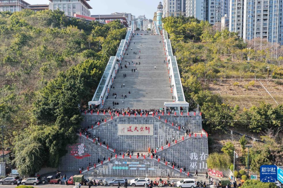 2月12日,重庆市巫山县“神女大扶梯”开启测试运行。扶梯串联政府、医院、学校、码头等城市功能节点,解决了沿线群众长期绕行、爬坡的出行难题。据介绍,扶梯总长905米,提升高度242米,包括电扶梯21部、垂梯8部、自动人行道4部、人行天桥2座和跨线通道2座等。