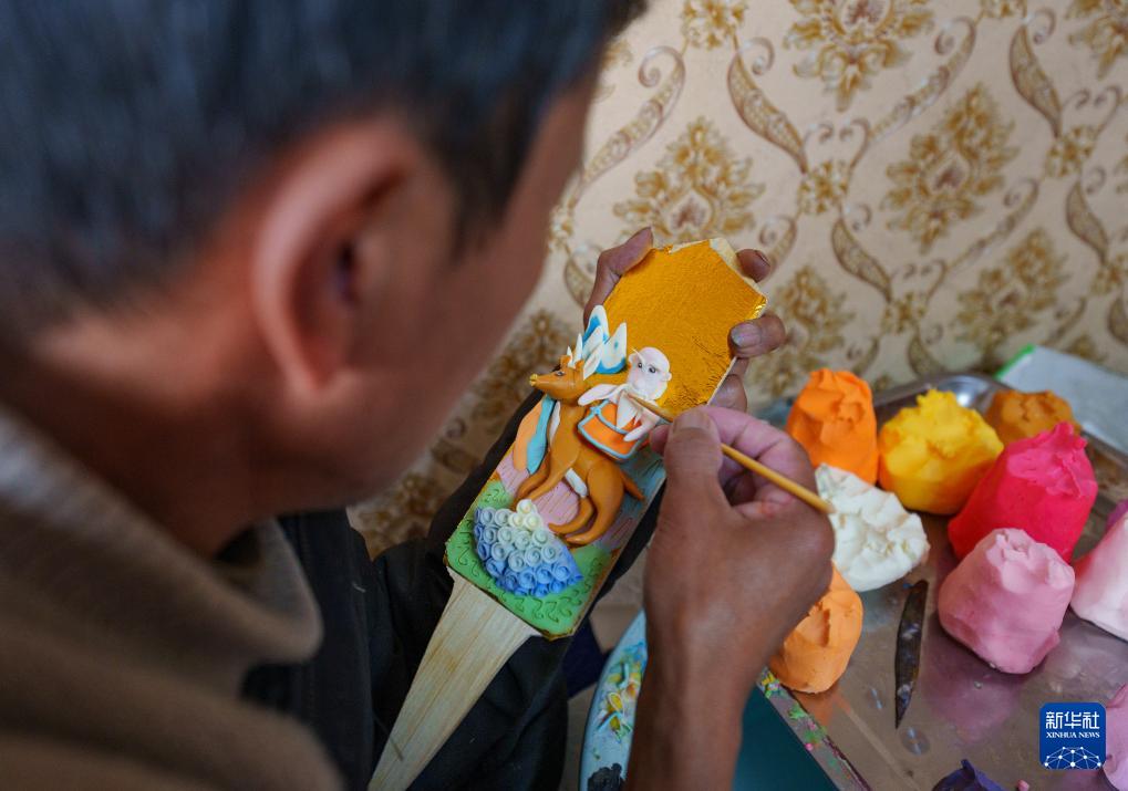 2月12日,在拉萨市林廓东路,来自西藏日喀则市仁布县普松乡的手工艺人罗布在制作酥油花。