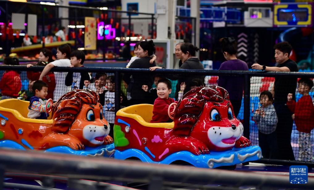 2月12日,小朋友在沈阳粮仓文化创意产业园内的“快乐专+”游乐场体验游乐项目。
