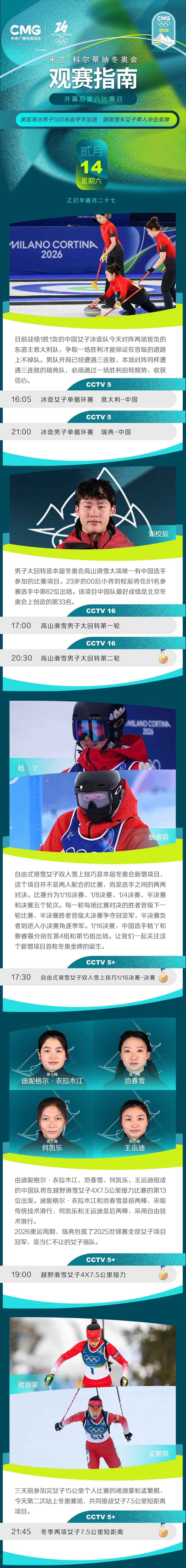 米兰-科尔蒂纳冬奥会开幕后第八比赛日,速度滑冰男子500米高亭宇出场,钢架雪车女子单人冲击奖牌。