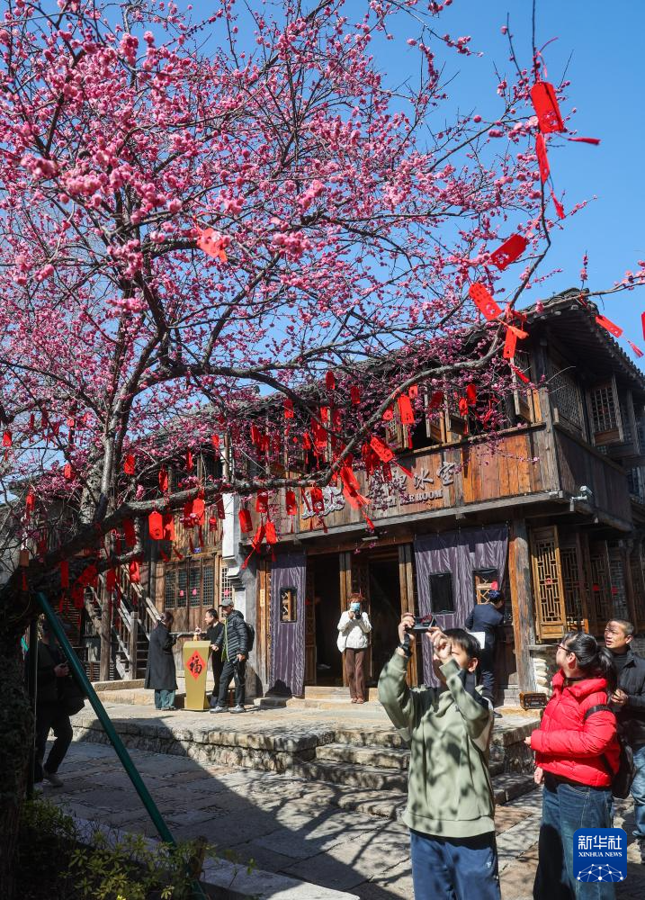 2月20日,游客在濮院时尚古镇内观赏盛开的梅花。