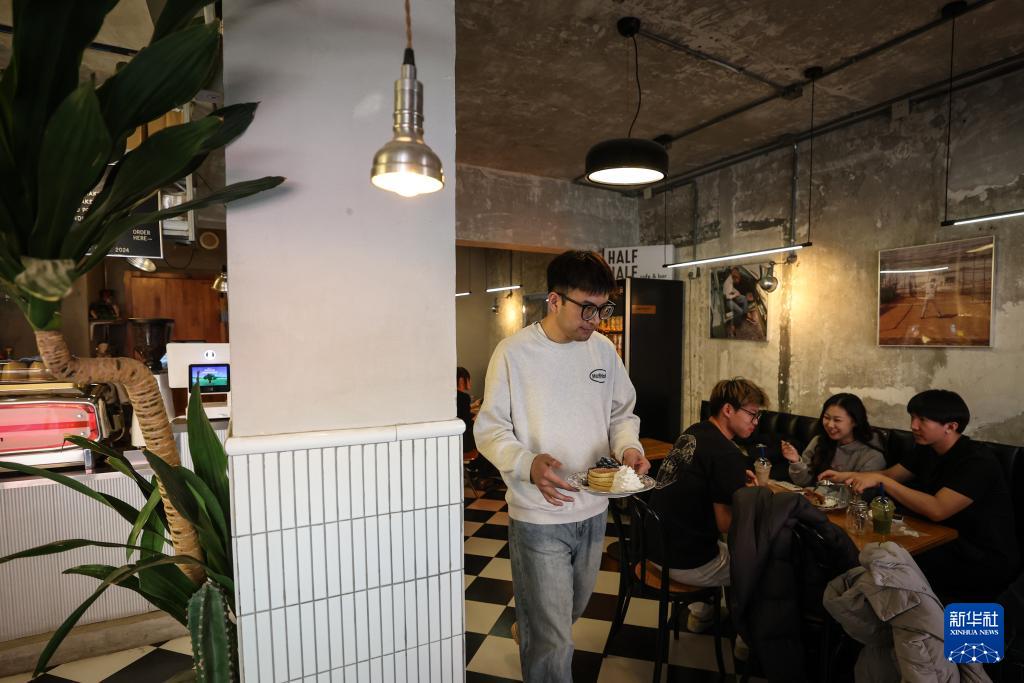 2月23日,八经咖啡小巷一家咖啡店内,工作人员为顾客送餐。