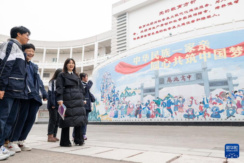 2月4日,在恩施土家族苗族自治州高级中学,张琼丽(右二)与学生从“中华民族一家亲 同心共筑中国梦”文化墙前走过。