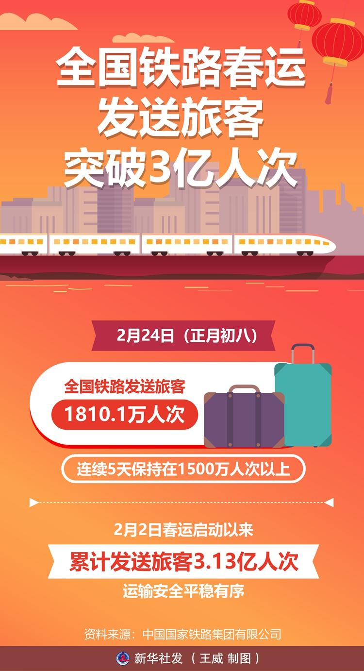 新华社北京2月25日电(记者樊曦)记者2月25日从中国国家铁路集团有限公司获悉,2月24日(正月初八),全国铁路发送旅客1810.1万人次,连续5天保持在1500万人次以上,2月2日春运启动以来累计发送旅客3.13亿人次,运输安全平稳有序。2月25日(正月初九),全国铁路预计发送旅客1665万人次,计划加开旅客列车1549列。