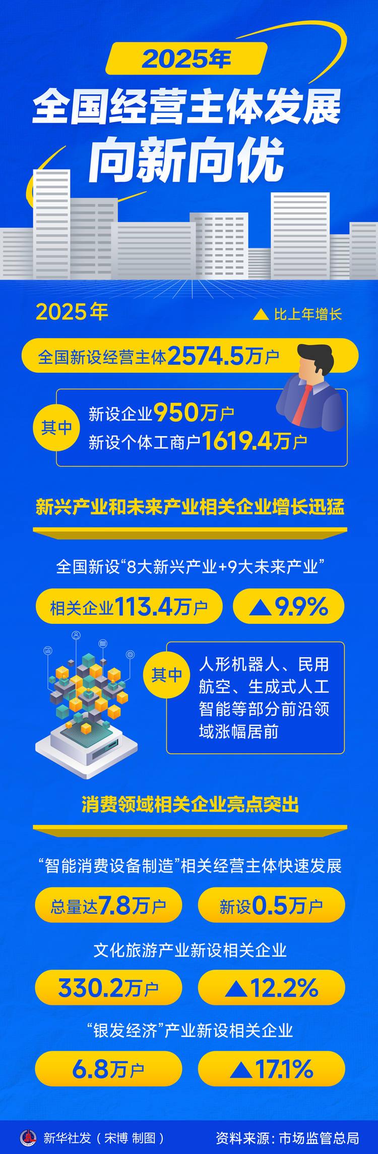 新华社北京2月26日电(记者王悦阳)记者2月26日从市场监管总局获悉,2025年全国新设经营主体2574.5万户。其中,新设企业950万户,新设个体工商户1619.4万户。经营主体呈现向新向优发展态势,为高质量发展蓄势聚能。
