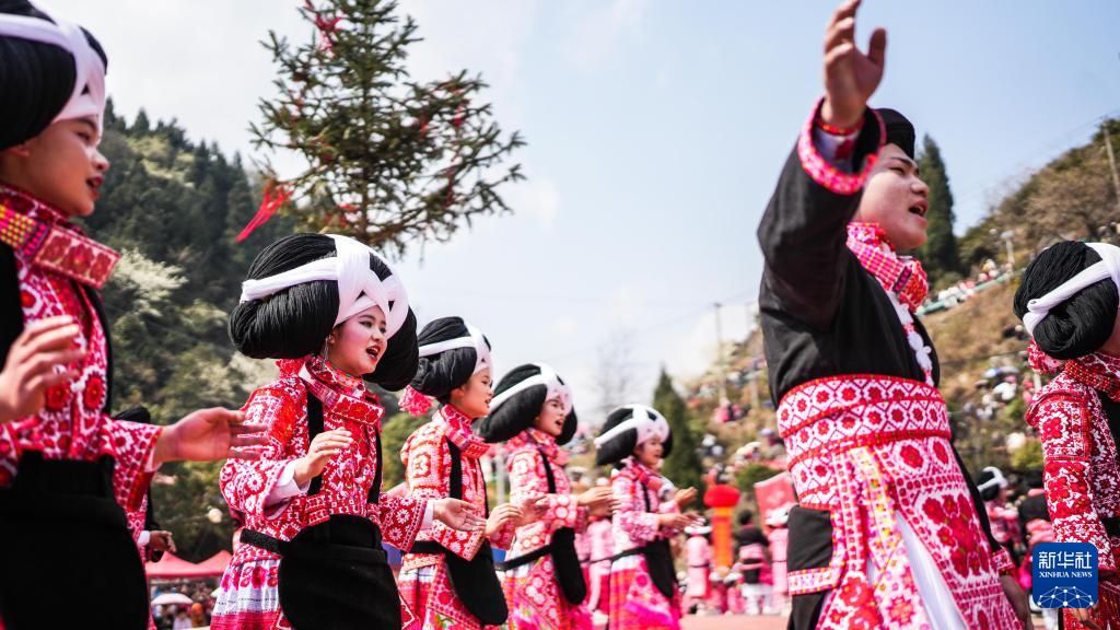 2月26日,在贵州省六盘水市六枝特区梭戛苗族彝族回族乡高兴村跳花场,苗族群众在演唱歌曲。