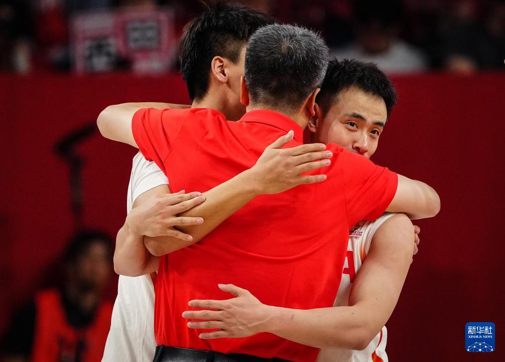 2月26日,中国队球员赵继伟(右)在比赛后与主教练郭士强庆祝胜利。
