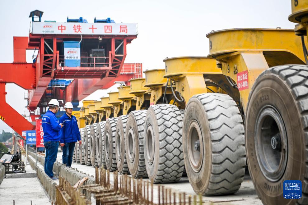2月26日,在重庆市合川区清平镇的西渝高铁建设工地,工人在进行架梁作业。