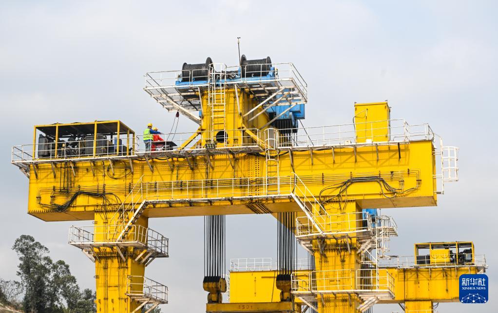 2月26日,在西渝高铁合川东制梁场,工人在提梁机上进行作业前的准备工作。