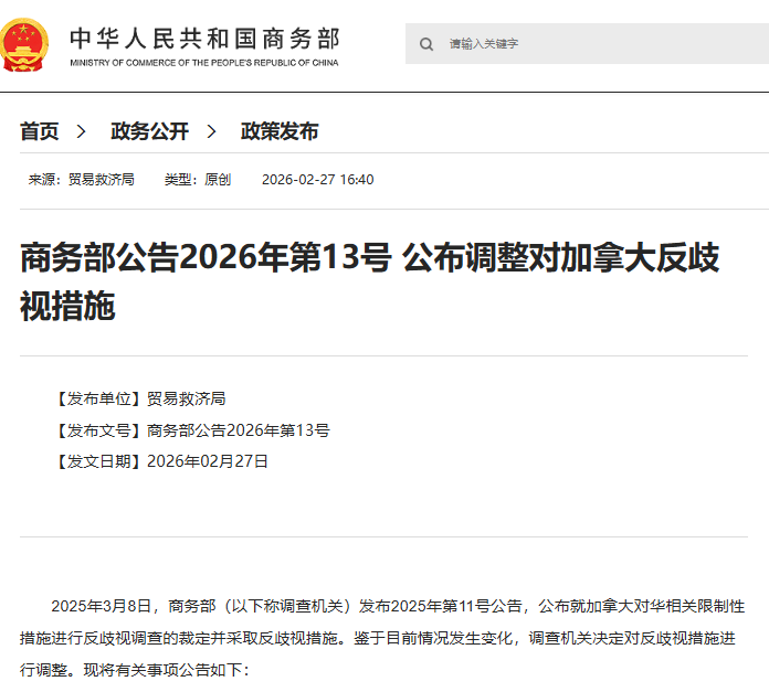 商务部公告2026年第13号 公布调整对加拿大反歧视措施