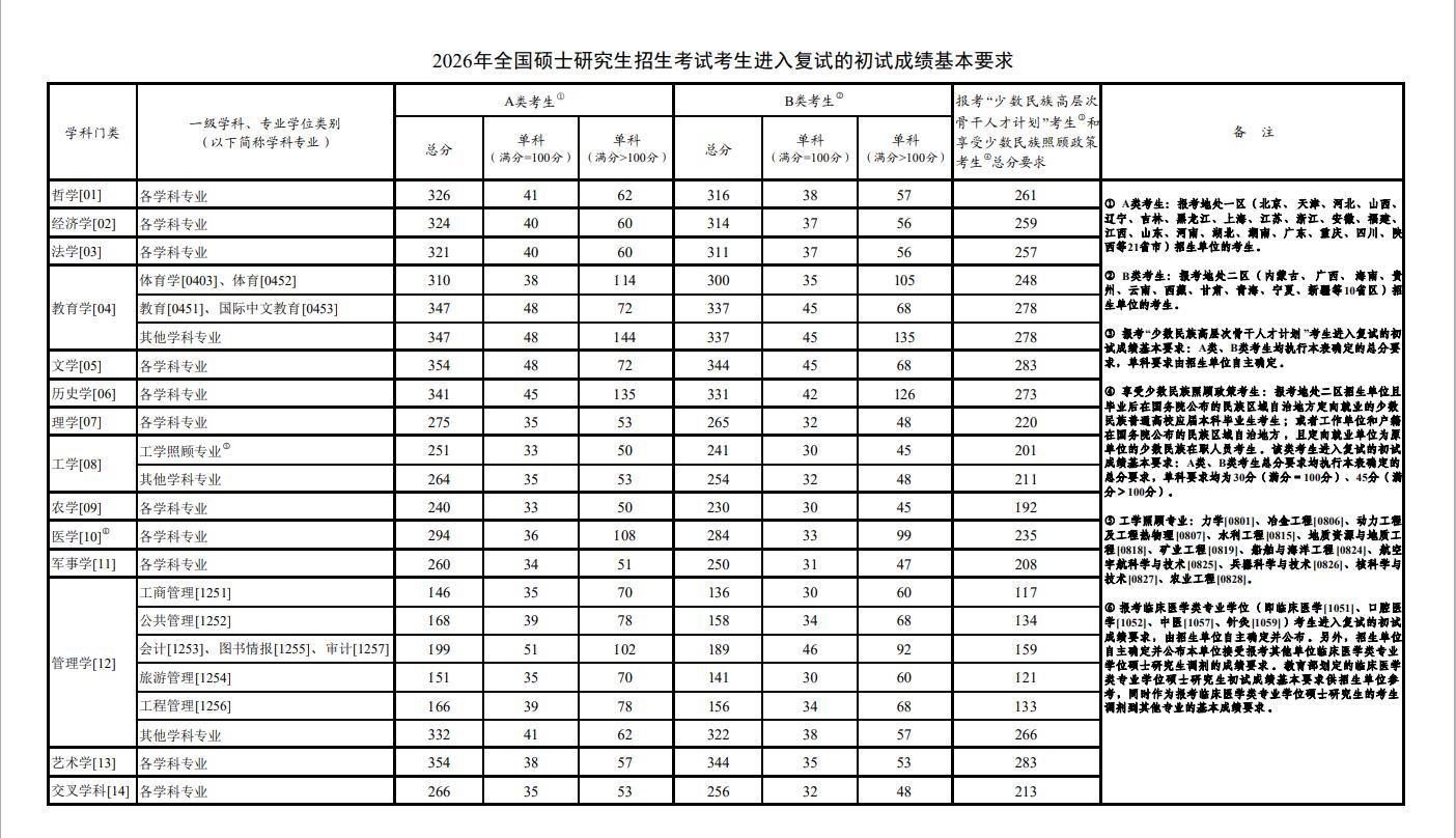 2月28日,教育部发布《2026年全国硕士研究生招生考试考生进入复试的初试成绩基本要求》(国家分数线)。各招生单位根据《2026年全国硕士研究生招生工作管理规定》,在国家分数线的基础上,自主确定并公布报考本单位的考生进入复试的初试成绩要求及其他学术要求。