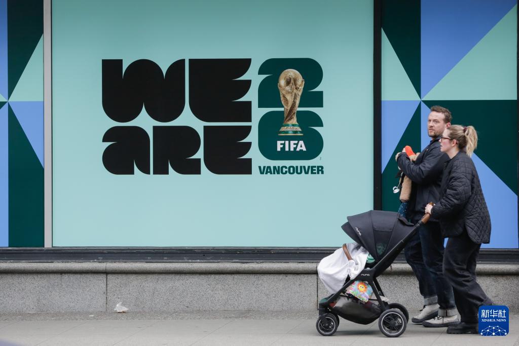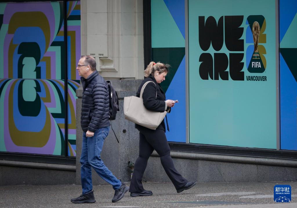 2月26日,行人从加拿大温哥华一栋建筑外的2026年国际足联世界杯宣传标识旁走过。