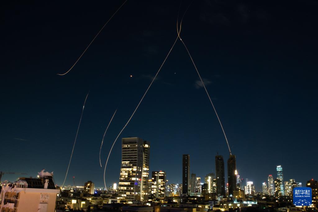 这是2月28日在以色列特拉维夫拍摄的以军发射拦截弹后的光轨。