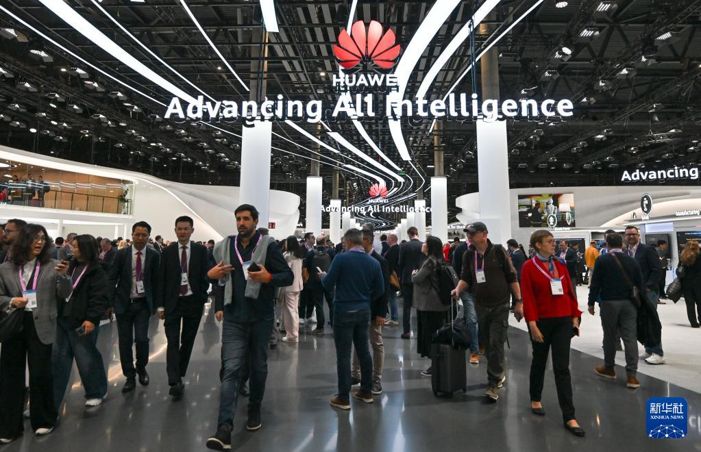 3月2日,在西班牙巴塞罗那,人们在华为展区参观。