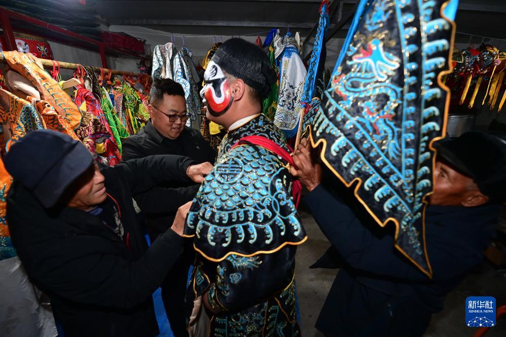 3月2日,陇县黄花峪村社火队队员在相互交流。