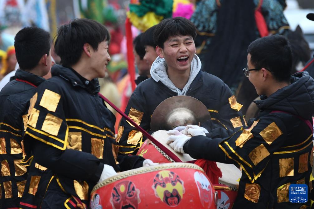 3月2日,陇县黄花峪村社火队的锣鼓队员在游演。