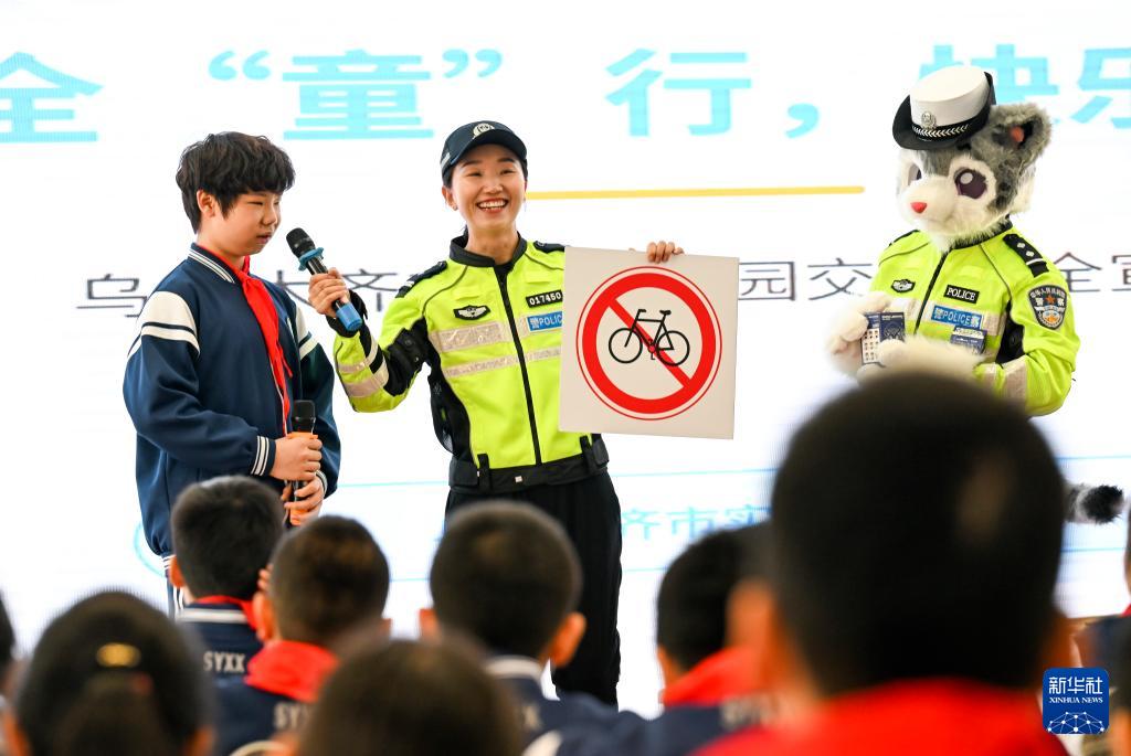3月2日,在新疆教育学院实验小学,乌鲁木齐市公安局交通管理支队开展交通安全宣讲进校园活动。