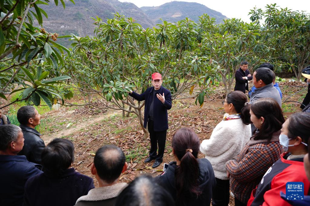 3月2日,在陕西省旬阳市城关镇两岔河村的枇杷林中,旬阳市林业技术推广站站长向甲斌向村民讲解果树管理的细节。