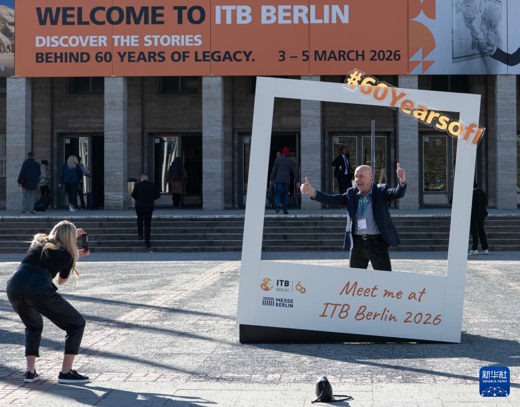 3月3日,在德国首都柏林,一名男子(右)在2026柏林国际旅游交易会的一处入口外拍照留念。