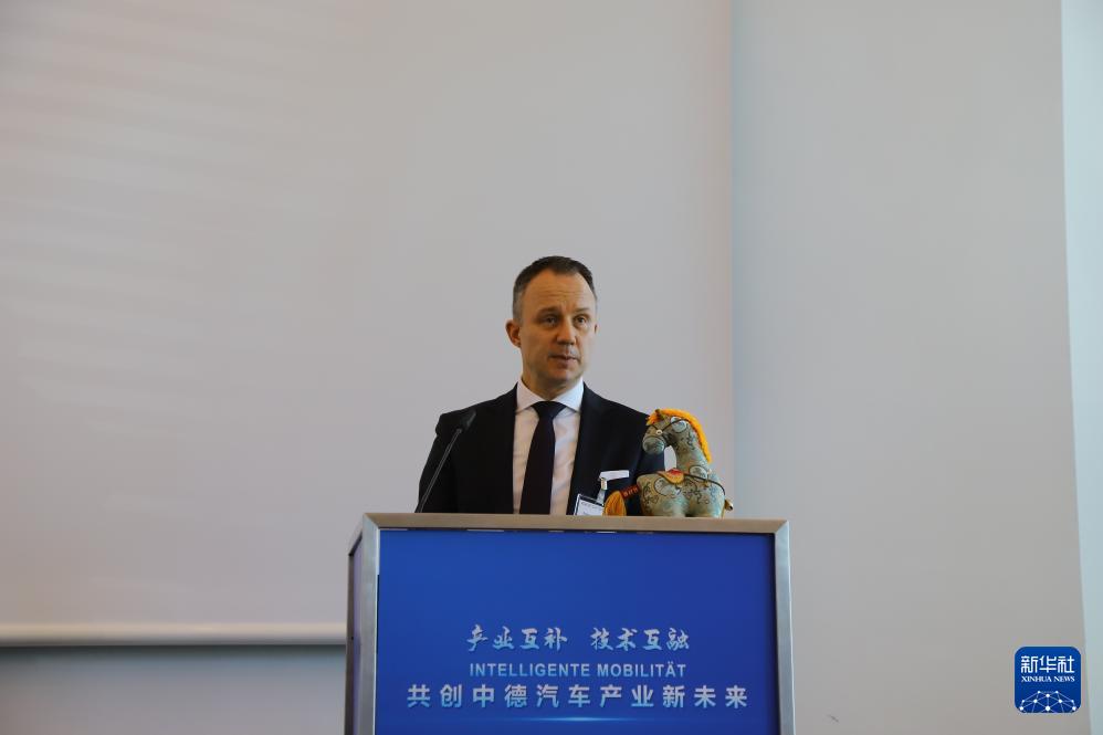 3月2日,在德国斯图加特,保时捷控股公司董事会成员、首席财务官约翰内斯·拉特魏因在“南京日”经贸推介活动上发言。