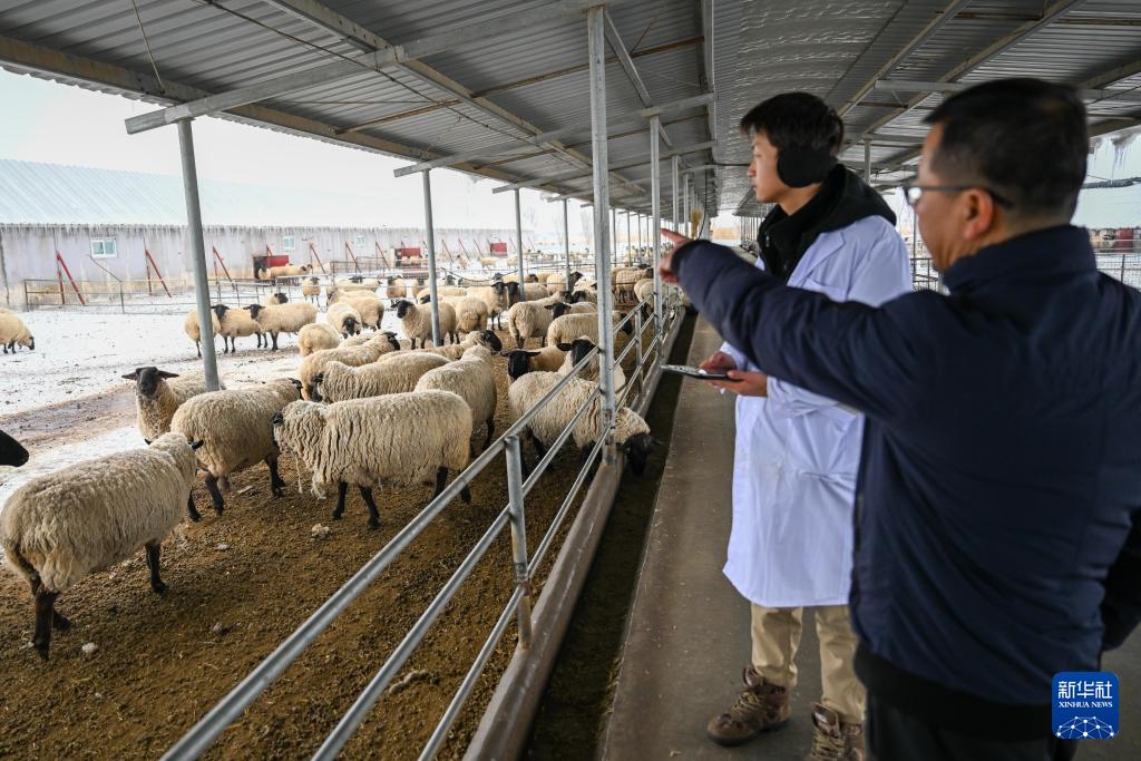 在位于新疆昌吉回族自治州的日发新西域玛纳斯牧业有限公司,工作人员观察待产母羊的状态(3月3日摄)。